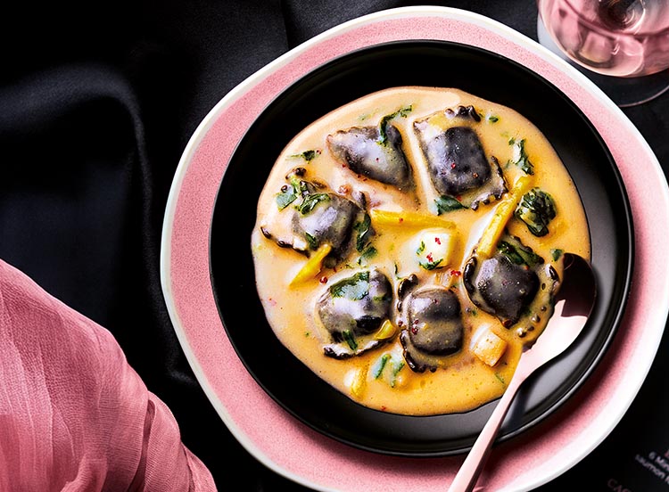Ravioles aux champignons 25,4% (farine de blé (gluten (blé)) (origine France) 9,9%, eau, champignon de Paris 4,3%, œuf de poules élevées en plein air (oeufs) 2,9%, ricotta (lactosérum (lait), lait (lait)), échalote, crème fraîche (lait) (origine France) 0,4%, encre de seiche 0,2% (maltodextrine, encre de seiche (mollusques)), beurre (lait), ail, sel, cèpe en poudre, piment basque), fond blanc de volaille (eau, carcasse de volaille, poireau, oignon, carotte, poivre noir, gros sel, clou de girofle), bouillon de légumes (eau, tomate, céleri (céleri), carotte, champignon de Paris, poireau, baie de genièvre), crème fraîche liquide (lait) (origine France) 8,5%, vin blanc Chardonnay (contient sulfites) 4,5%, épinard (origine France) 4,1%, panais 3,1%, carotte jaune 3,1%, échalote, beurre (lait), champignon de Paris 1,6%, amidon, eau, farine de blé (gluten (blé)), Parmigiano reggiano AOP* (parmesan) (lait), sel, oignon, carotte, beurre concentré (lait), poivre noir, poivre blanc, piment basque, correcteur d'acidité : carbonate acide de sodium