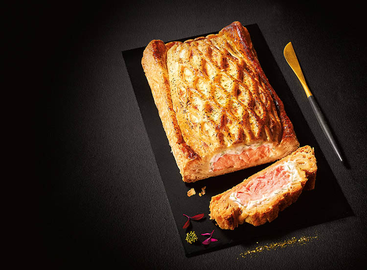 Morceaux de filets de saumon Atlantique (Salmo salar (poisson) élevé en Norvège) 41,4%, pâte feuilletée 35,7% (farine de blé (gluten (blé)), eau, margarine (huile végétale (palme, colza), eau, sel, émulsifiant : mono- et diglycérides d'acides gras, correcteur d'acidité : acide citrique, arôme naturel, vitamine A), eau, sel), eau, fromage à la crème 5,1% (lait (lait), crème (lait) 1,8%, sel, ferments lactiques (lait)), lait entier (lait), cheddar (lait) 2,2%, oignon, crème (lait) 0,7%, amidon transformé, beurre (lait), farine de blé (gluten (blé)), jaune d'œuf de poules élevées en plein air (oeufs), aneth 0,1%, sel, ail, bouillon végétal (sel, amidon, extrait de levure, lactose (lait), oignon en poudre, sirop de glucose, poivre, curcuma, noix de muscade , huile de colza, livèche, ail, extrait de romarin), moutarde en poudre (graine de moutarde (moutarde), curcuma), poivre blanc, farine de blé malté (gluten (blé))