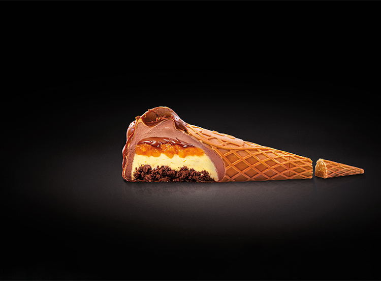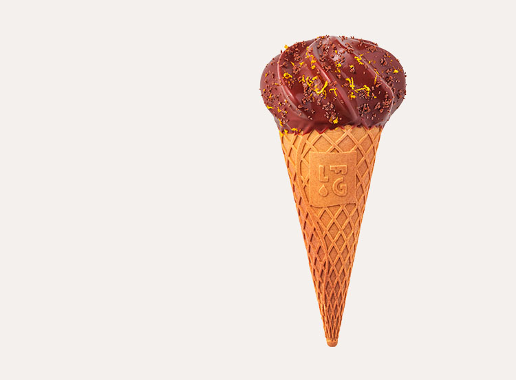 Dans notre atelier givré nos pâtissiers concoctent ce produit de leurs propres mains ! Le plein de gourmandises, avec un streusel cacao au beurre d’Echiré AOP Charentes-Poitou, un sorbet chocolat noir Macaé Valrhona, une glace à l'orange - au jus d’orange frais et au lait entier et crème fraiche des mont d’Ardèche, une sauce praliné et et une coque de chocolat Dulcey Valrhona. A la pointe du cône tu trouveras la gourmandise de tes rêves un fourrage au praliné croustillant !
