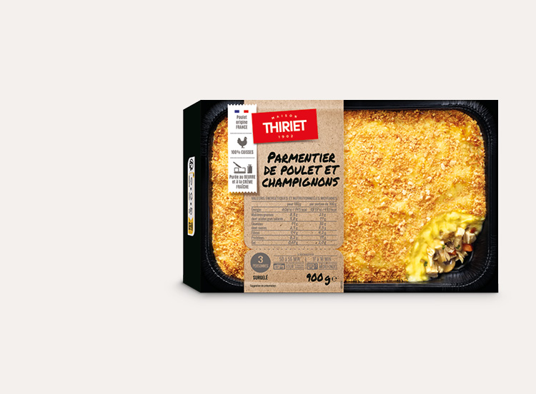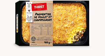Purée de pomme de terre 60% (eau, pomme de terre déshydratée, lait écrémé en poudre (lait), beurre (lait) 3,5%, crème fraîche (lait) (origine France) 1,9%, sel, émulsifiant : mono- et diglycérides d'acides gras, curcuma), morceaux de viande de haut de cuisse de poulet traités en salaison cuit 15,6% (viande de haut de cuisse de poulet (origine France) 13,4%, eau, sel), eau, champignon de Paris 5,9%, graisse de poulet, pomme de terre déshydratée, oignon, chapelure 1,8% (farine de blé (gluten (Blé)), levure, sel), carotte orange, vin blanc, épices et plantes aromatiques, ail, sel, émulsifiant : mono- et diglycérides d'acides gras