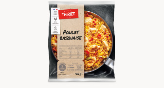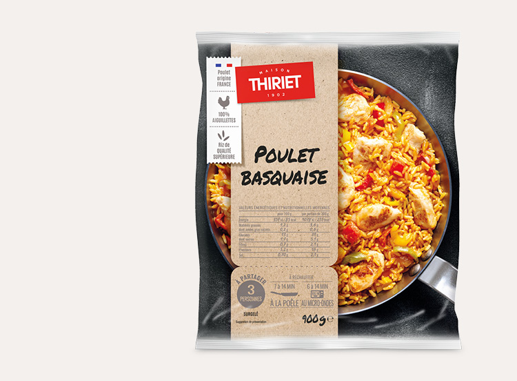 Riz long cuit de qualité supérieure 38,5% (eau, riz), viande de poulet traitée en salaison rôtie 17% (viande de poulet (origine France) 14%, eau, dextrose de blé, fécule de manioc, sel), pulpe de tomates au jus 11,5% (tomate, jus de tomate), eau, tomate 4,4%, double concentré de tomate 3,5%, oignon 3,3% poivron vert 3,3%, poivron rouge grillé 3,2%, poivron jaune 1,1%, huile d'olive, ail, sel, vin blanc (raisin, acidifiant: acide tartrique, conservateurs: sulfites), fond de volaille (bouillon et graisse de poulet, carotte, sel, plantes aromatiques), amidon transformé, basilic, thym, romarin, piment d'Espelette AOP* 0,01%, poivre noir, laurier