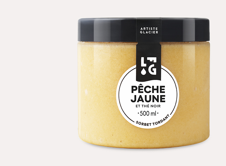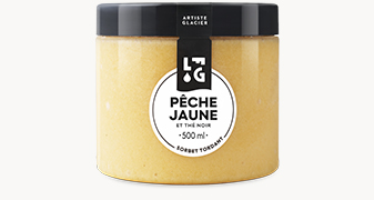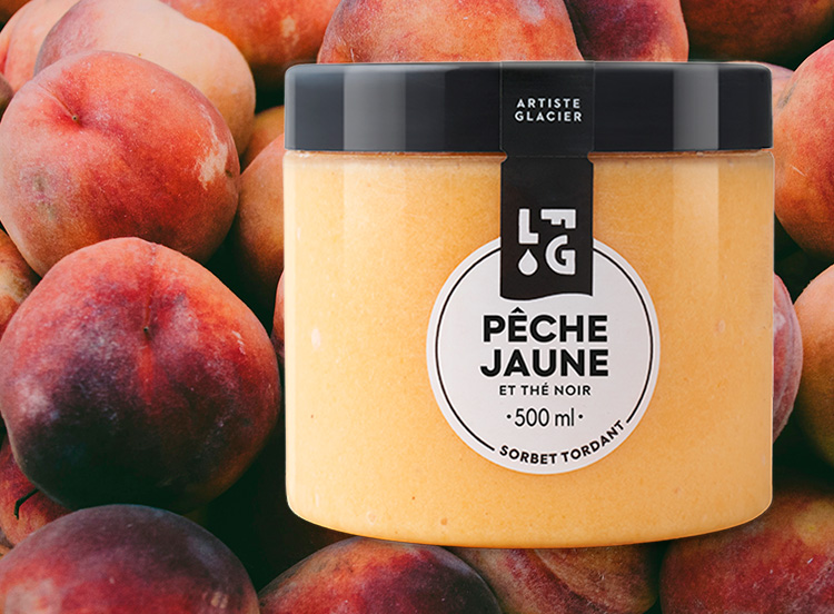Dénomination de vente : Produit surgelé. Sorbet plein fruit Pêche jaune et thé noir